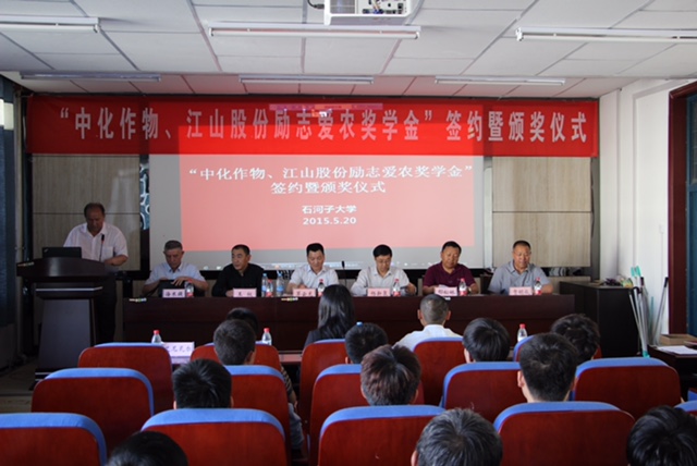 5月20日,由南通江山農(nóng)藥化工股份有限公司與中化作物保護品有限公司聯(lián)合捐助的“中化作物、江山股份勵志愛農(nóng)獎學(xué)金”簽約暨首次頒獎儀式在石河子大學(xué)農(nóng)學(xué)院隆重舉行。公司黨委副書記茅云龍、中化作物副總經(jīng)理王權(quán)、石河子大學(xué)校長助理楊新泉、農(nóng)學(xué)院黨委副書記艾尼瓦爾等校院領(lǐng)導(dǎo)以及校輔導(dǎo)員、學(xué)生代表參加了簽約及頒獎儀式。